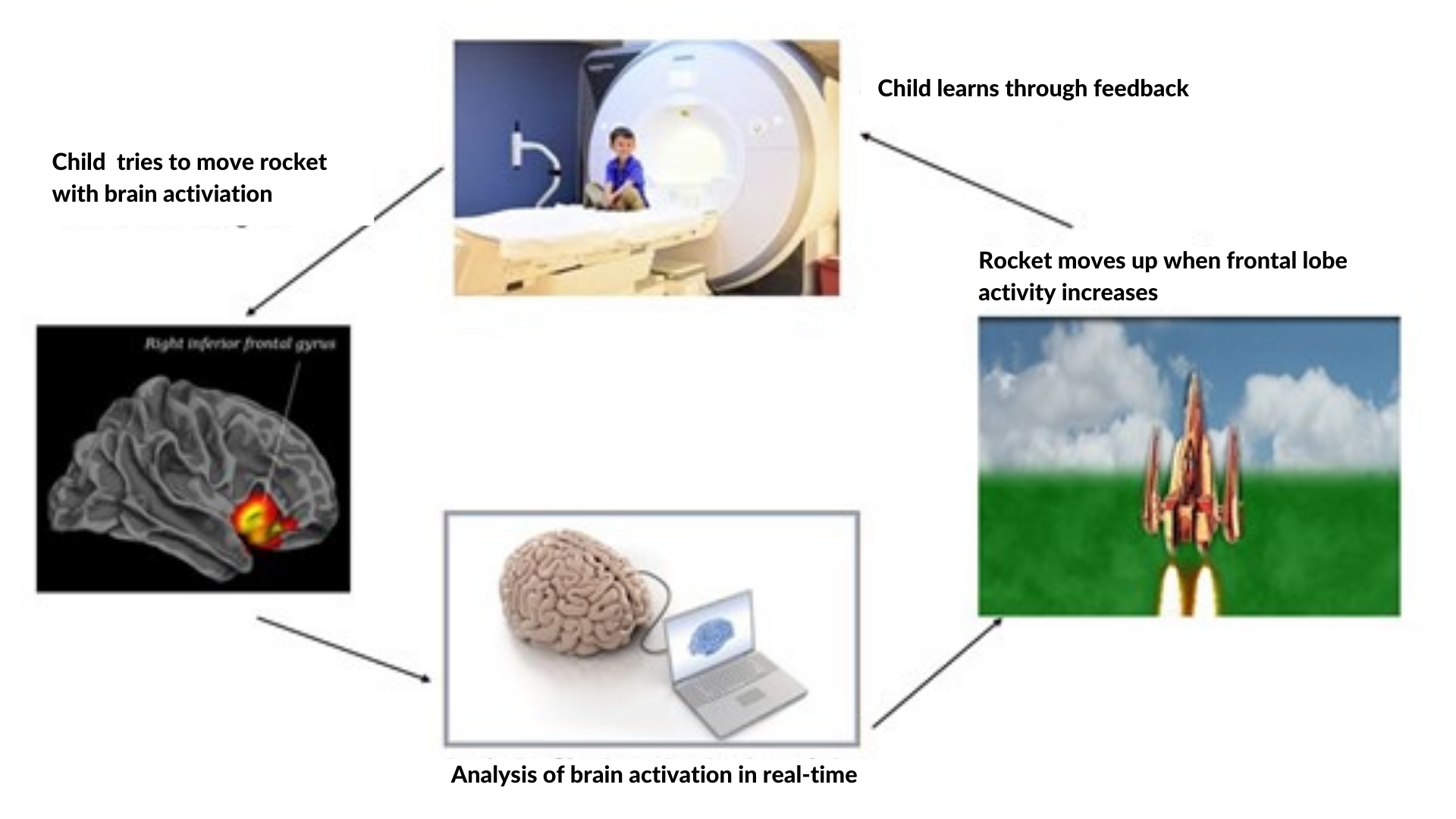 We have developed a potential new ADHD treatment called neurofeedback. A fun computer game trains the brains of children with ADHD during brain scanning (functional magnetic resonance imaging). While training, the children receive feedback about when their brain activity increases, shown as a rocket moving in the videogame.