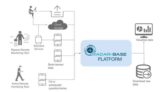 The National Institute for Health Research (NIHR) Maudsley Biomedical Research Centre developed the RADAR-base mHealth platform, a scalable, real-time streaming platform for digital health-related signals. It has secure data collection, storage and management. It can accept information from apps for ‘active’ remote monitoring, such as questionnaires, and passive monitoring, such as heart rate or GPS using sensors from smartphones and wearables (Fitbit, Garmin).